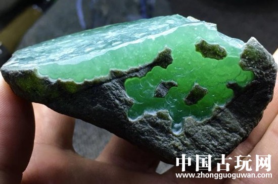 在对翡翠原石开窗扒皮前,要对它进行擦石,指在原石有翡翠表象的部位为中心,用砂纸研磨它,确定大概位置。再用专业的打磨机,在这个位置开窗,开出里面晶莹的玉料。再沿着开窗处,用砂轮机慢慢剥去表层外皮,露出包含在内的完整翡翠。