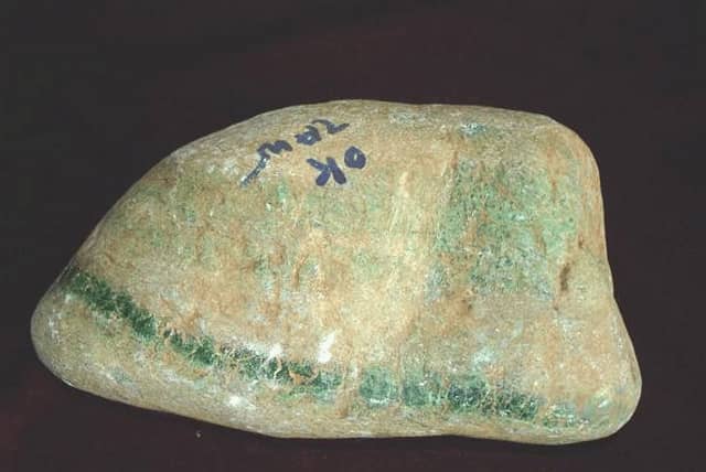 绿色的多少和色质的好坏决定着翡翠的品质和价值,因此,要注意通过观察砾石内部绿色部分在表皮上显露的种种迹象,推断其内部绿色的状况。绿色的多少,与绿色部分的形态和分布特点有关。翡翠中的绿色部分以呈团状和条带状集中分布者较有价值。这样的绿色显露于表皮时往往也呈团状或线状,也有时会呈片状。当绿色在表皮上以大面积片状出现时多为表皮绿,其内部往往无绿;而当绿色在表皮上呈线状或团状出现时,特别是当表皮上露出的绿线呈对称分布时,其绿会向内部延伸,甚至贯穿整块砾石。后者的价值自然比前者高,因此,有行话说“宁买一线,不买一片”。