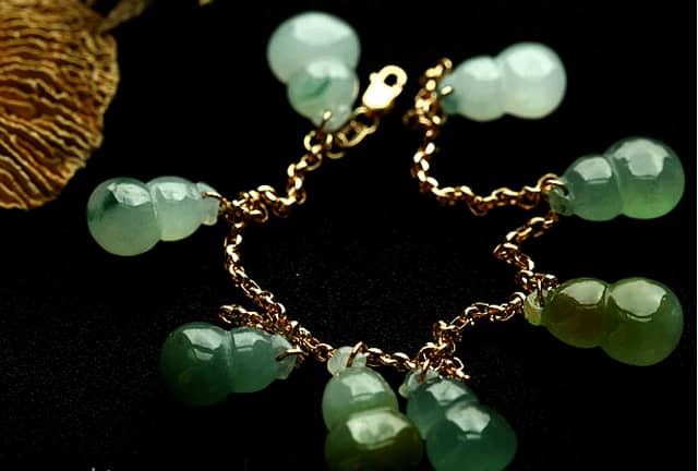 贵金属与翡翠结合,构成脚链。此类款式中,我们常见的链子为贵金属,多采用的是金和银,翡翠的形状各异,如圆珠,福瓜,葫芦,貔貅,平安扣,叶子,佛手等。可采用镶嵌也可不镶嵌,镶嵌类的脚链较少见,较奢华。若采用镶嵌,则工艺可以采用爪镶,在满足固定翡翠的同时也呈现了灵活的造型;若不镶嵌,翡翠多为有孔眼,贵金属直接穿过孔眼连成脚链。此大类的翡翠脚链,贵金属营造出的造型,新意奇特加上贵金属的奢华,多给人一种高贵典雅之感。