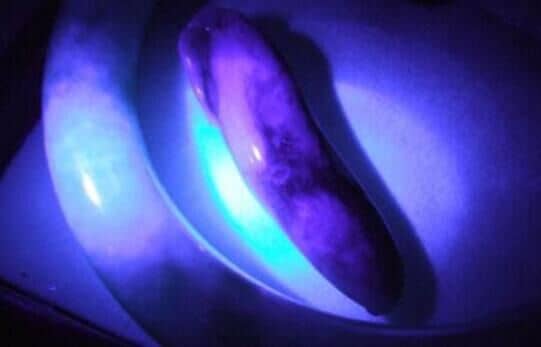 2、翡翠的反光。白色翡翠在紫外灯的照射下,因为紫外灯本来就是紫色的,所以会透有紫色的光。