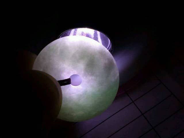 还有一种鉴定方法是经常被人们拿来说的,就是用紫光灯手电筒照射,看看翡翠的是否有荧光反应。还是那句话,首先如果一块翡翠是假的翡翠,在紫外光灯的照射下,翡翠上沾有荧光剂的地方就会有荧光反应,所以像翡翠b货和翡翠c货这些就是很容易分辨的。