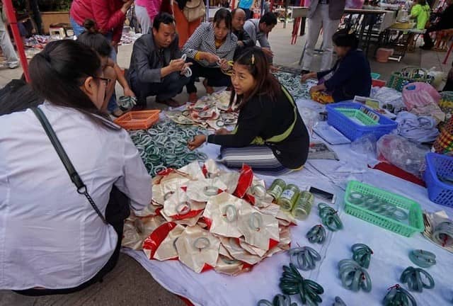 德龙夜市也有很多的缅甸人摆摊,在珠宝城的几条主道上都是有的,这里繁华异常。在这里把毛料摆好,点上一盏小灯就可以了,如果想在这里淘宝的话要拿着手电筒仔细挑选哦,可以讨价,那就要看自己的功力了。