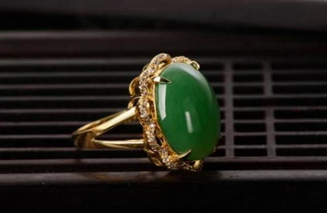接下来,小编简单介绍几类翡翠戒指,第一,黄金蛋面翡翠戒指,这种戒指的翡翠是满绿翡翠戒面群镶钻石的极品翡翠镶嵌女戒。