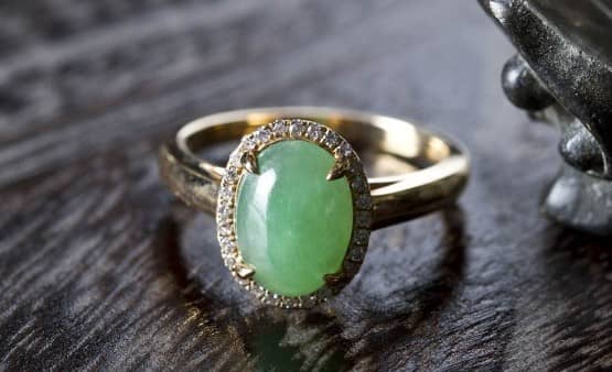 黄金翡翠戒指的制作其实也很简单,就是将翡翠打造成戒面石,然后和金指环粘在一起。这种粘合方式一般都用全包粘合,然后还可以用黄金“抓”的方式,把翡翠牢牢的镶嵌在黄金戒指上,一般情况下,翡翠戒面暴露在外面会比较好看。但这两种粘合的手段不同的人可以根据自己不同的爱好来决定。还有,一般情况下,黄金翡翠戒指的指环为黄金,这种样式一般都是这,虽然没有人规定,但也没有人去改变这种模式,而不一样的只有其黄金手环上面粘合的翡翠的大小、形态、厚度、宽窄的不一样。因为翡翠属于玉石,也就是石头,不可能是透明的,所以它不可以像宝石、钻石那样磨成刻面,总是琢磨成素面形,亦称弧面形。