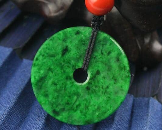 干青种翡翠颜色浓绿悦目,色纯正不邪,硬玉结晶呈微细柱状、纤维状(变晶)集合体,晶体颗粒肉眼都看得见,透明度很差,质地粗糙底干,因此由干青种翡翠制成的饰品多是属于中低档,比如玉佩、吊坠、手镯和一些雕件等。干青种翡翠的绿色形成是因为它的内部铬离子含量比较高,铬离子含量越是高的,翡翠的绿色就会变得更加浓艳,有的甚至还超越了铁龙生翡翠。当铬离子含量高到一定程度时,硬玉就会变成钠铬辉石了,也就是我们说的“干青”。