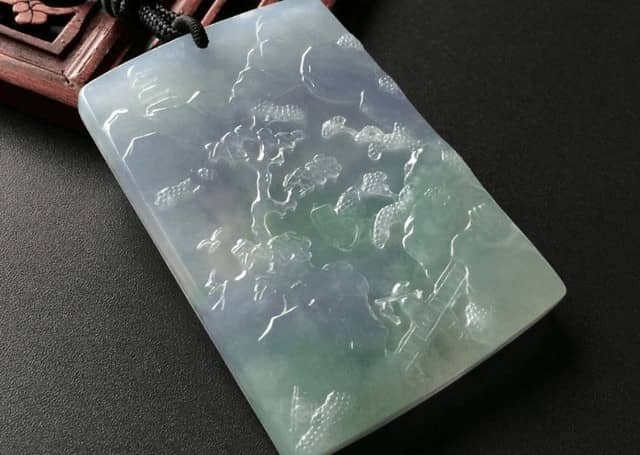 上面也提到了,翡翠山水牌吊坠比起常规的翡翠吊坠在尺寸上更显大气,这和它自身的寓意,以及所需雕刻的图案有关。如果是一般质地的翡翠,还真不适合用于山水牌。它的用料很有讲究,必须圆润饱满,色泽均衡,且质地干净剔透,给人一种很清爽的感觉,这样才能符合山水的意境。光是用料方面的讲究和挑剔,就决定了山水牌翡翠界的不俗地位。