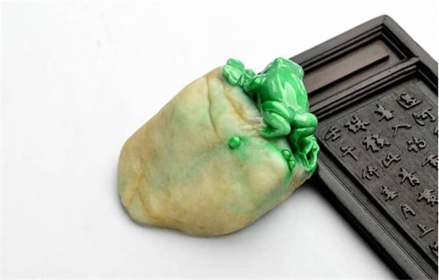 4.在翡翠摆件的图案上,青蛙常和南瓜、如意一起出现,它有一鸣惊人、福寿如意、财源滚滚的寓意。