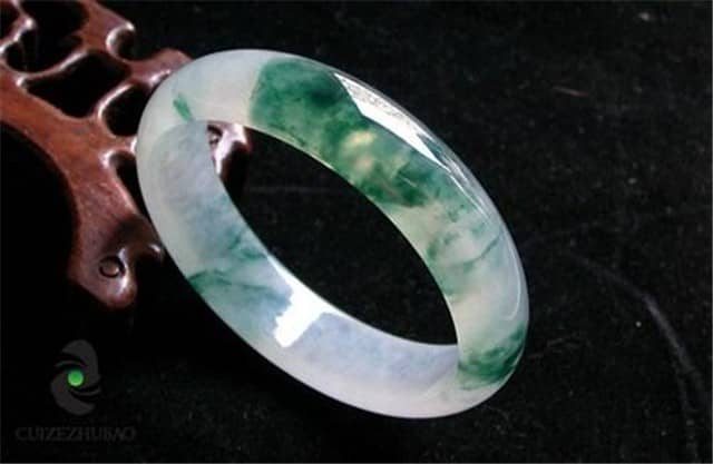 白底青翡翠肉质底色以白色或乳白色色调为主,颜色有绿色、蓝绿色,或者在两者之间过渡的颜色。颜色似“云朵”般飘浮,颜色成团、成块、成片状呈现,飘浮在白色或乳白色的玉质上,或者轻微地渗入玉质内部,而没有与玉质融洽统一在一起,这样一类翡翠称为白底青翡翠。