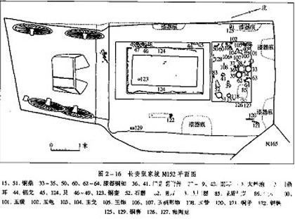 从墓葬形制来看,西周都城遗址内发现的西周墓葬有双墓道大墓、单墓道大墓、竖穴墓和洞室墓几种,其中带墓道的大墓级别最高,发现的数量也很少。丰镐遗址的张家坡墓地只发现1座双墓道大墓、3座单墓道大墓,共4座井叔墓;洛阳北窑西周墓地只发现2座双墓道的大墓,铸铜遗址发现1座双墓道大墓;洛阳东郊的摆驾路口和东大寺发现1座双墓道大墓、4座单墓道大墓。值得注意的是,洛阳铸铜遗址和东郊发现的大墓,其墓道都是方折拐角的,有人以为是殷人传统,而称之为“殷人墓”。这类大墓几乎全部被盗扰,随葬器物被洗劫一空,幸而墓葬形制犹存。 张家坡西周墓地M157是丰镐遗址迄今发现的惟一双墓道大墓,被认为是井叔家族墓地的第一代井叔之墓。墓室是一个长方形的土坑竖穴,长5.5米,宽4米,深及泉下。墓室的南北各有一条斜坡墓道,南墓道较宽而长,为主墓道,北墓道椁长3.95米,宽2.6米,高1.84米。
