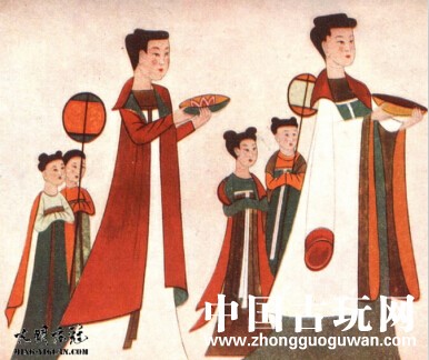 第二枚“供养人•隋”,此壁画原型位于第390窟。 供养人一般指提供资金、物品开凿洞窟的功德主、施主等,因此供养人壁画也是敦煌石窟艺术中一项十分重要的内容,是研究洞窟营建时代及窟主一手资料,同时也为研究古代服饰提供了重要依据。壁画上的女供养人高腰系带,外加长披,裙裾长垂曳地,并且身后伴随小童。