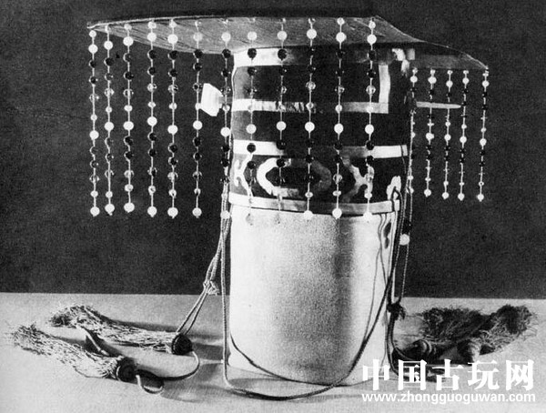 万历帝棺内还出土了一件皮弁,胎为细竹丝编结成六角形网状作胎,上髹黑漆,内衬红素绢一层,面敷三层黑纱,口里侧衬一层红素罗。口沿外用金箔贴金箍一道。皮弁前后各十二缝,每缝内钉包金竹丝一缕。缝中各缀玉珠九颗、珍珠三颗。玉簪一件,为二段,每段各有穿孔两个,备穿线系结。系于簪两端的红色圆绦带通长115、缨长7.8厘米。