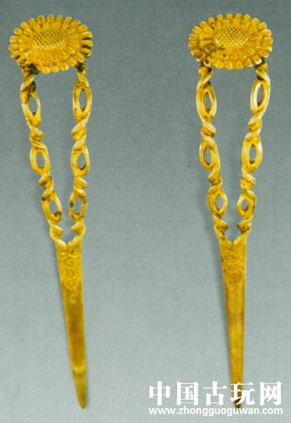 菊花金簪一对,簪首为菊花形状,花蕊细密。长14厘米。