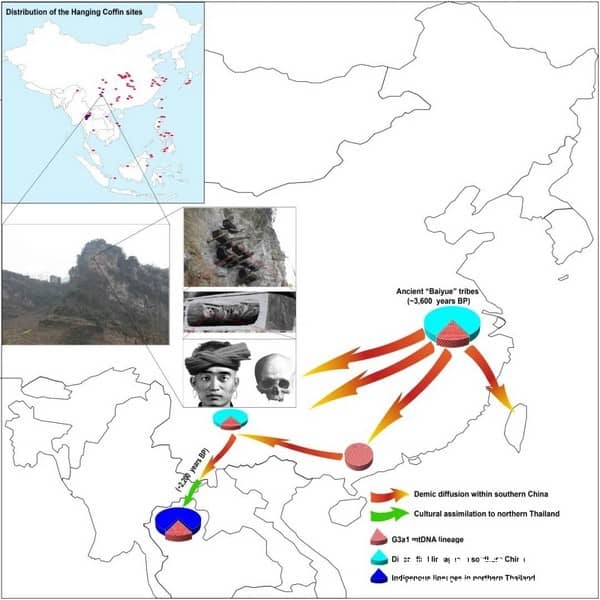 研究者发现昭通的悬棺葬人群母系遗传世系遗传多样性非常高,而泰国北部悬棺葬人群的遗传多样性相对较低,该结果符合悬棺葬习俗在中国南方起源并向南流传到东南亚的观点;研究者将遗传学分析结果与考古学、体质人类学、民俗学和历史学等的证据相结合,推测悬棺葬习俗约在距今3600年前起源于中国东南沿海地区(如武夷山地区)的百越族群中,他们是现今民族众多的侗傣语系族群的先祖;之后,悬棺葬习俗以大量人群迁徙和流动的方式,母系遗传多样性非常高,在广泛的华南地区流传;然而,大约在两千年前,非常少数的悬棺葬习俗传承者(G3a1世系人群)以文化同化的方式将该习俗大面积传播到了泰国北部等东南亚地区的一些原住民群体(比如孟高棉民族)中并广为流传。