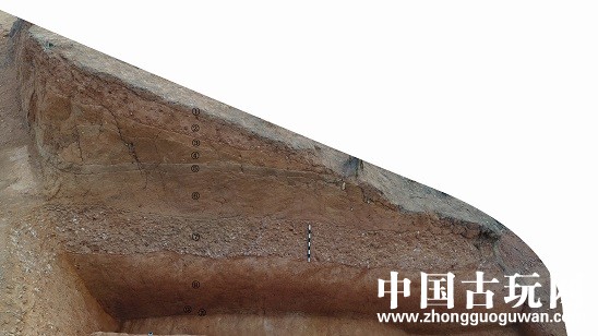 东墙体部分区域已被破坏,其构筑方式与北墙体略有差异:首先于原地表稍加修整,再于其上逐渐堆筑形成墙体。墙体由上至下可分为10层,第5层至第10层近水平状堆积,第1层至第4层呈斜向堆积。东墙体亦未发现夯筑痕迹。东墙体残宽9.73、高6.2米。墙体外侧亦有壕沟,口大于底,沟壁呈斜壁内收,沟底为圜底。沟口宽2.5、沟底宽0.72、深1.14米。
