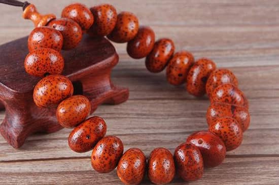 千眼菩提因为表面有很多斑点所以被命名为千眼菩提子,千眼菩提质地坚硬,不仅是实心的,而且密度较大,所以非常用来适合雕刻,一般被用来做手串和手链,一串千眼菩提价格能卖到600元左右。