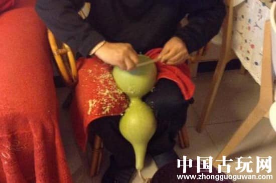 文玩葫芦摘下后,在确认葫芦成熟的情况下,需要先将葫芦晾晒几天,这样可以避免葫芦因为打皮时出现严重紧缩的现象。葫芦内部的水分蒸发一部分后,就可以通过钝刀刮皮、打皮机或自然干燥的方式进行打皮。