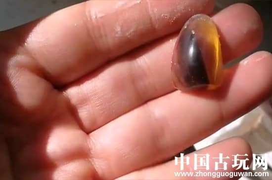 红玛瑙的相对密度是2.65,血珀的相对密度是1.08,同等体积下,红玛瑙比血珀重。将它们放入饱和的食盐水中,沉下去的是红玛瑙,浮起来的是血珀。