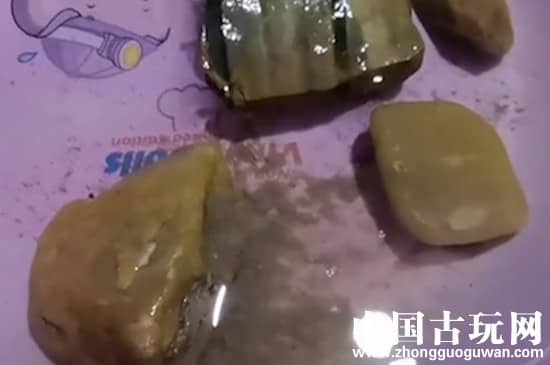 此外分辨玉石原石和普通石头也可以看手感,用手触摸天然玉石原石时,给人的感觉是冰凉的,触摸一段时间后,温度会逐渐上升。而普通石头的温度会随环境变化,不会有冰凉感。