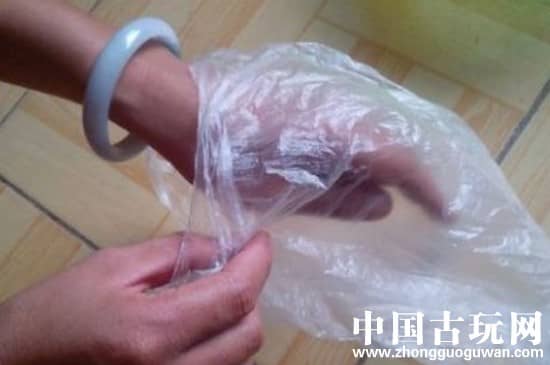 此外摘下玉镯也可以使用塑料袋,把手装进塑料袋后,再把塑料袋的袋口穿过玉镯,只有将塑料袋开口反过来,同样可以减少玉镯和手腕之间的摩擦力,最后就可以慢慢将玉镯捋下来。